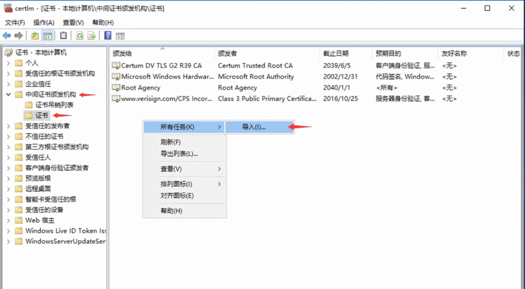 在“不信任的证书”上右键,选择“所有任务”“导入”